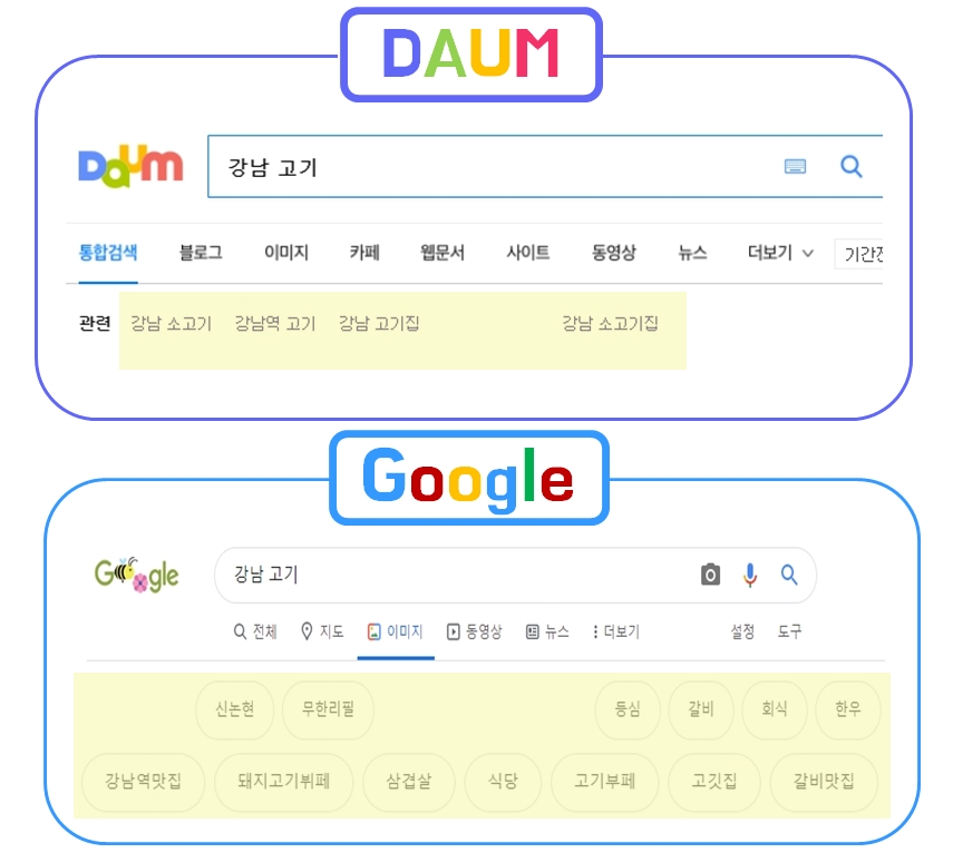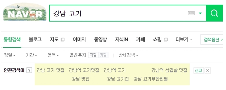 위에 설명드린 내용과 같이 만약 사용자가 '강남 고기'라는 키워드를 검색했을 때, 검색어와 연관되어 있는 검색어를 확인할 수 있고